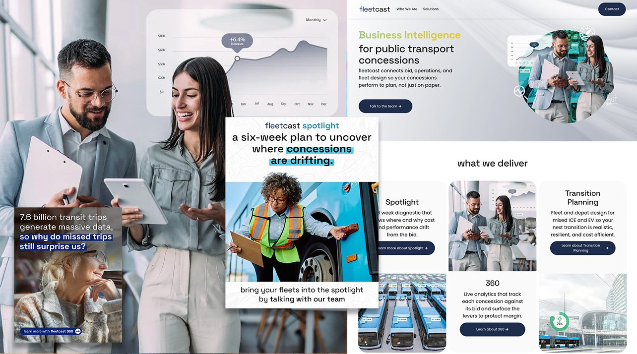 I positioned fleetcast's three offerings directly on the landing page — Spotlight, 360, and Transition Planning — giving each a dedicated space to breathe, as well as following the same clear logic: what it is, why operators use it, what you get, how it connects to the others. No jargon. No generic analytics language. Direct communication to fleet decision-makers who understand buses, routes, and depot operations in an editorial-like fashion.