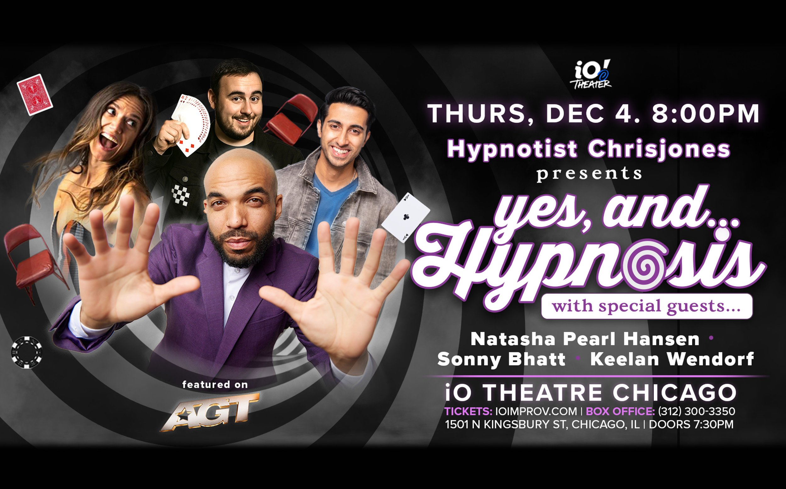 CarmelloVision partnered with Hypnotist Chrisjones to design the promotional rollout for Yes, And… Hypnosis, a live comedy and hypnosis experience staged at Chicago’s iconic iO Theatre. The campaign translated the show’s hypnotic, playful energy into a cohesive design system used across web, print, and social platforms.