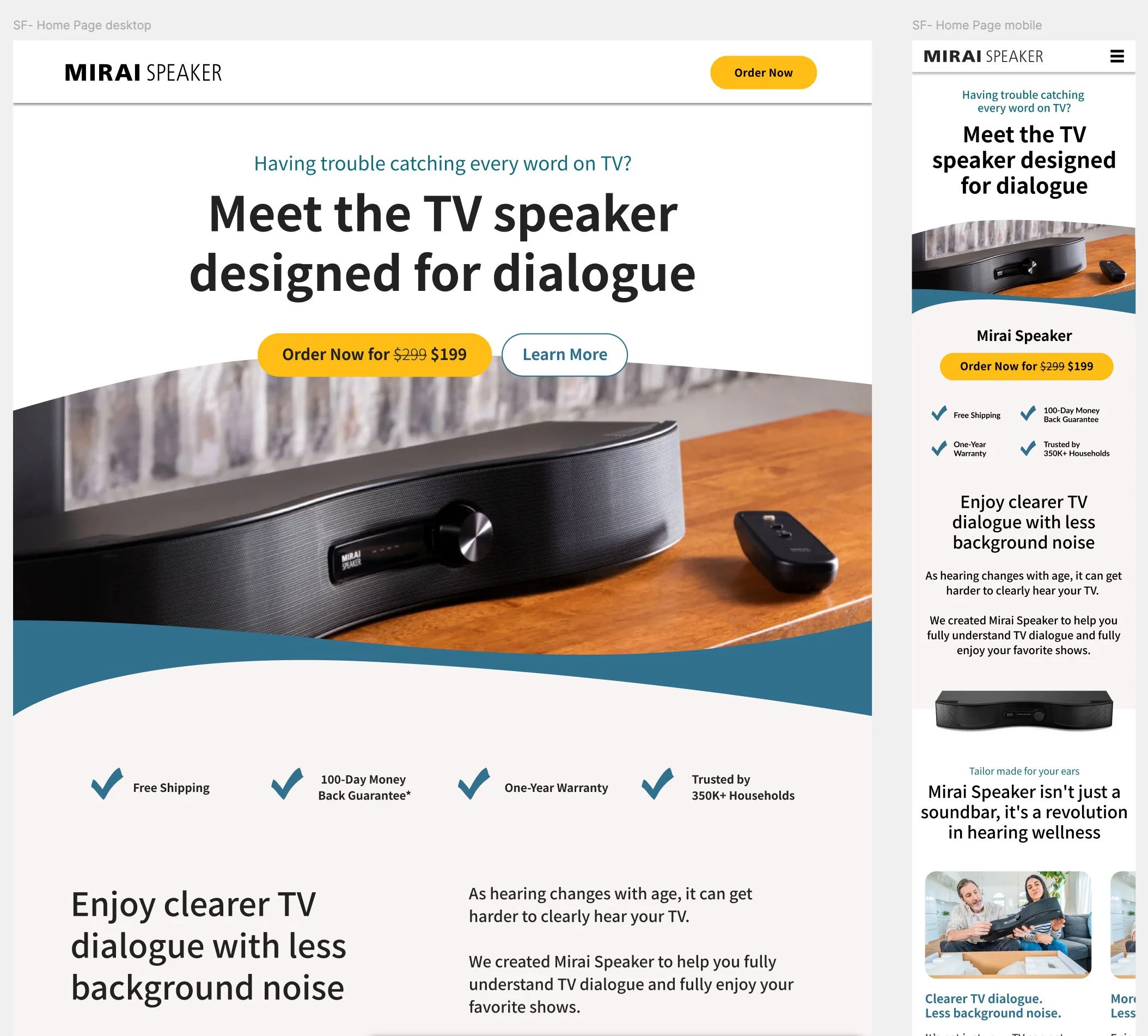As Lead UX/UI Designer, I led the design and optimization of Mirai Speaker’s brand-owned e-commerce site ahead of its November 2023 launch — with a focus on increasing direct-to-consumer sales, clearly communicating product benefits for hard-of-hearing users, and reducing friction across the purchase journey.
