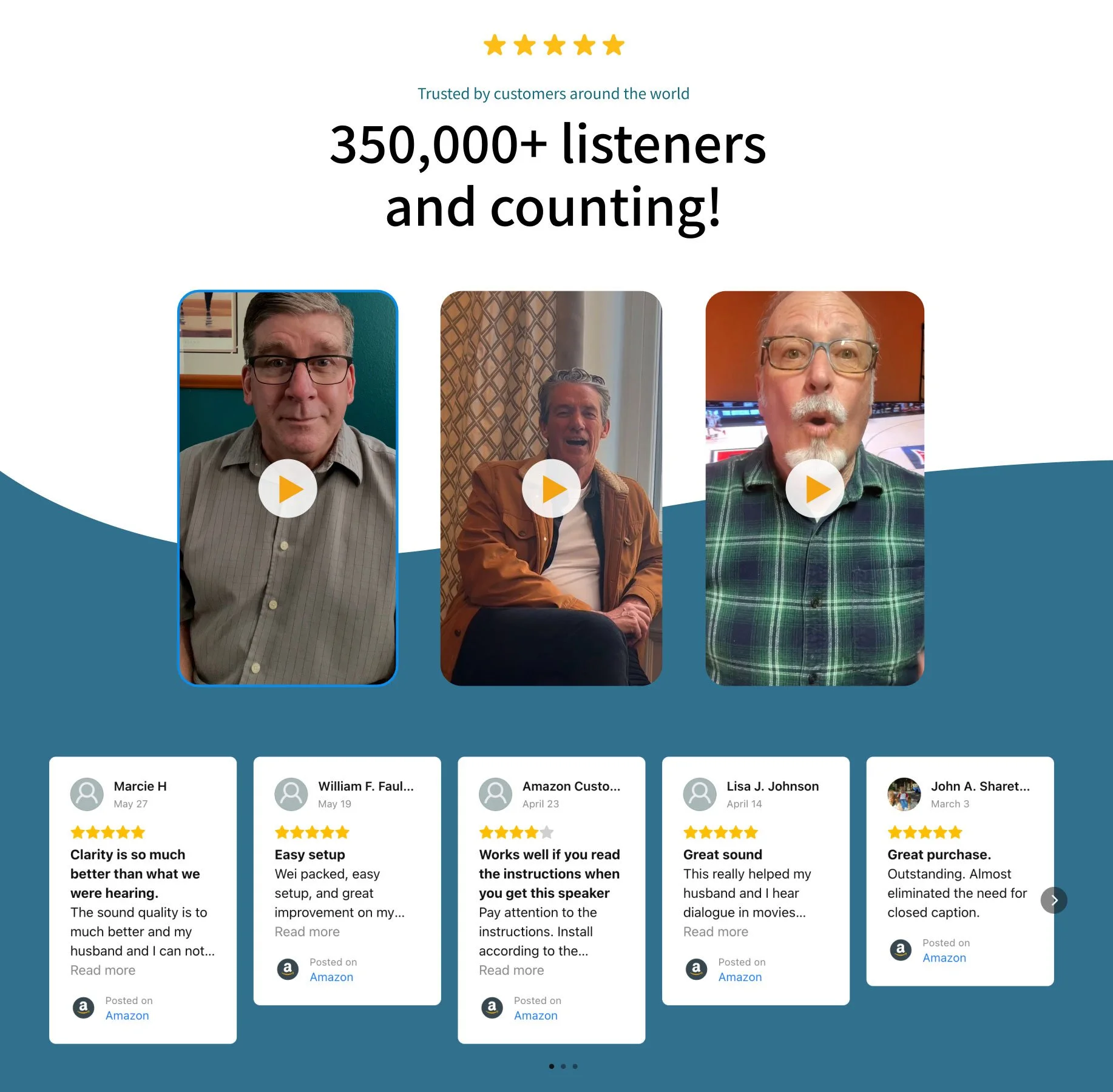 To strengthen credibility, especially addressing an older population reliant on reviews, I integrated Amazon reviews directly into the site experience and paired them with customer testimonials. This combination helped reduce uncertainty and correlated with a noticeable reduction in product returns. We also introduced other items as well, such as the total amount of purchasers “350,000 and counting” aside from keeping transparency of reviews on our Amazon for users to see if it was a best fit for them.