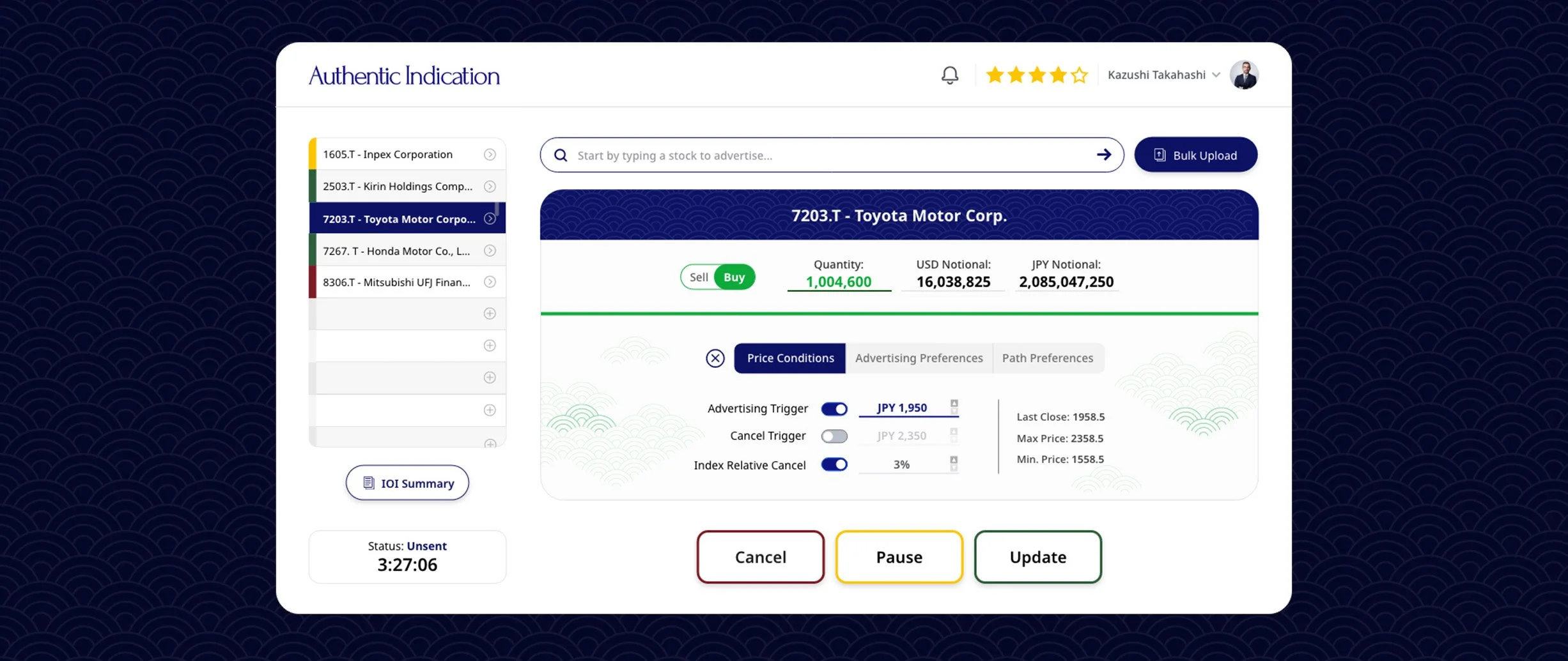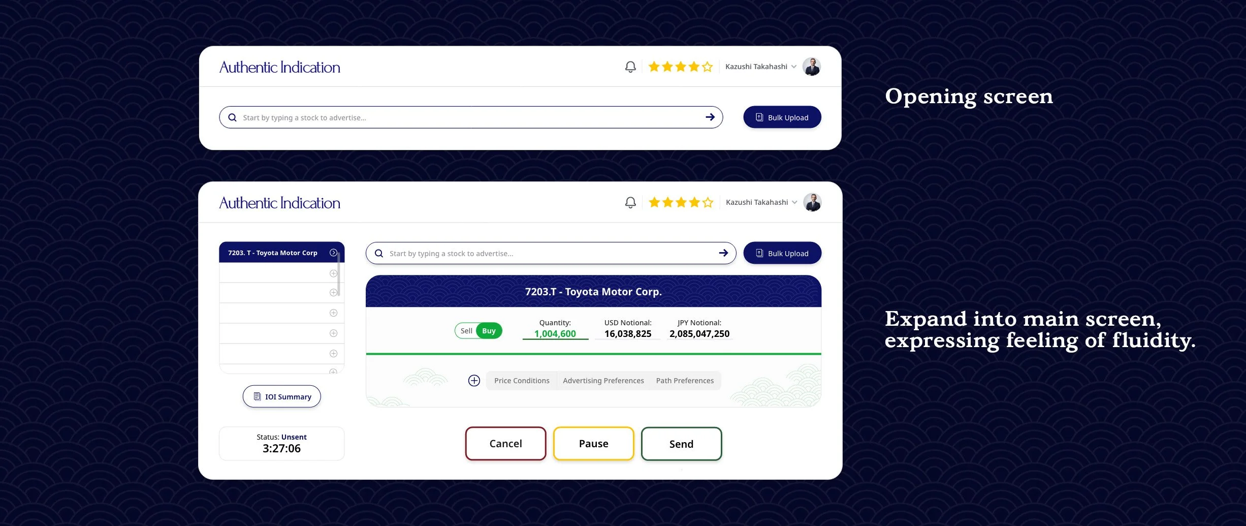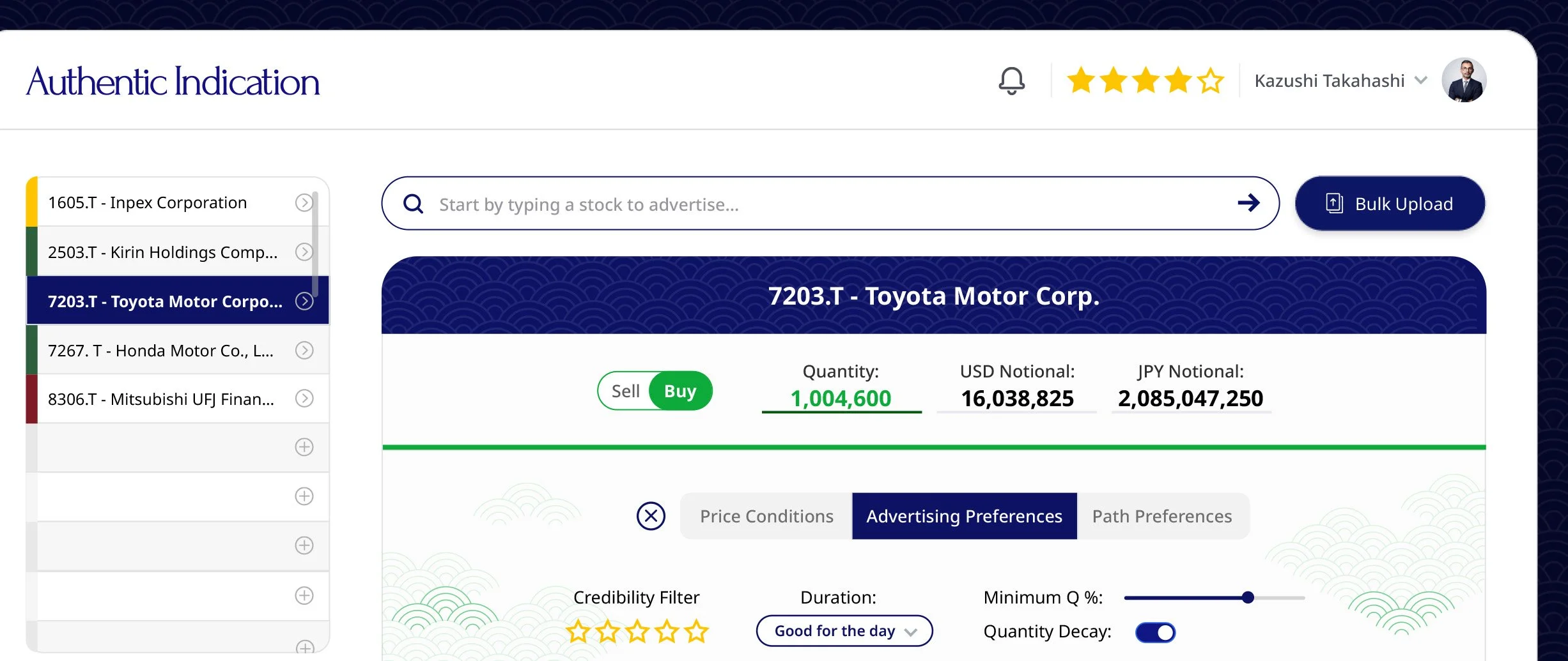 Upon loading / searching for stocks, institutional users under time pressure don't need a dashboard that announces itself — they need to move fast. From search, an IOI is created with a Buy/Sell toggle, quantity input, and dual-currency notional display in both USD and JPY. Three expandable tabs, Price Conditions, Advertising Preferences, and Path Preferences let users set advertising triggers, cancel triggers, index-relative cancels, credibility filters, duration, and broker priority rankings before sending.