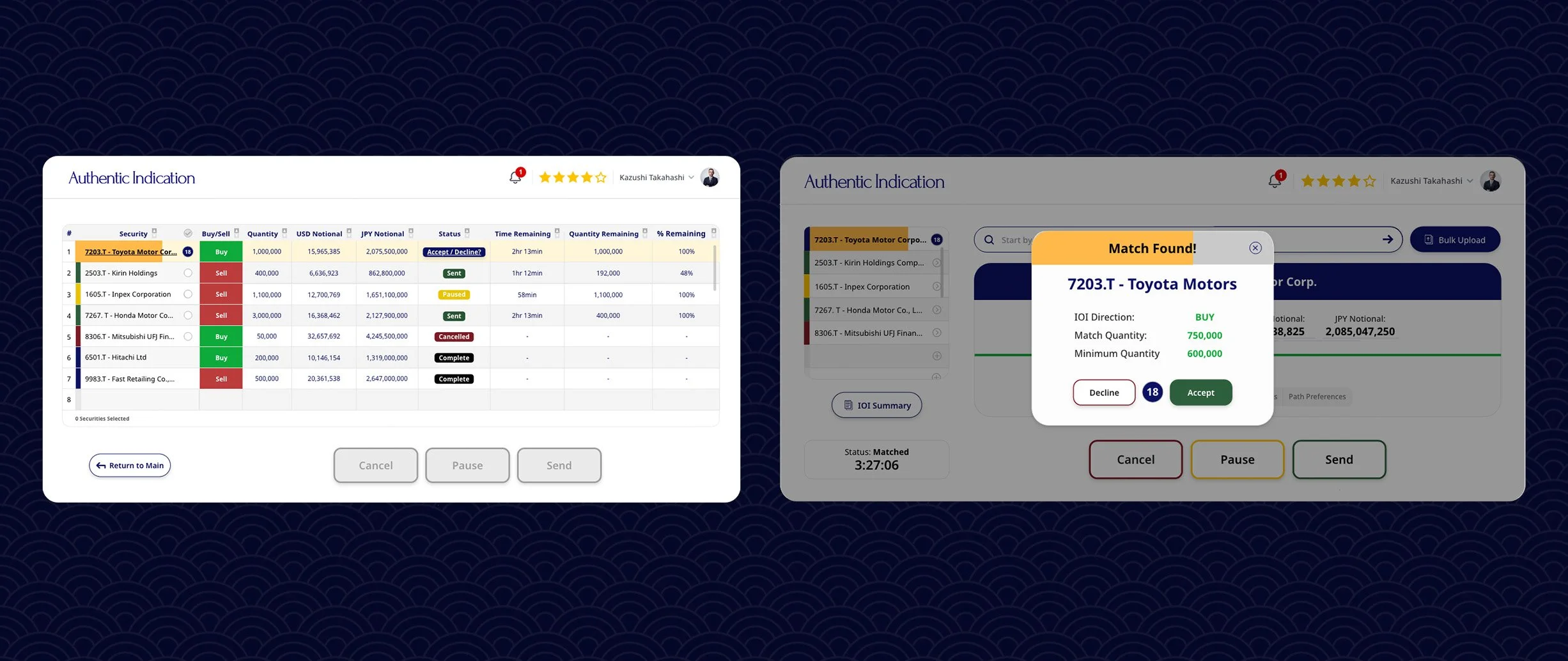 Institutional users managing multiple active IOIs simultaneously needed a single view that told the whole story at a glance. The IOI Summary dashboard presents all active positions in a table with color-coded Buy/Sell indicators, real-time status badges (Sent, Paused, Cancelled, Complete, Accept/Decline), time remaining, quantity remaining, and percentage remaining. Bulk selection allows Cancel, Pause, or Send actions across multiple IOIs simultaneously. When a match notification arrives, the relevant row surfaces an Accept/Decline prompt inline — keeping the user's attention on the match without pulling them out of their full portfolio view.
