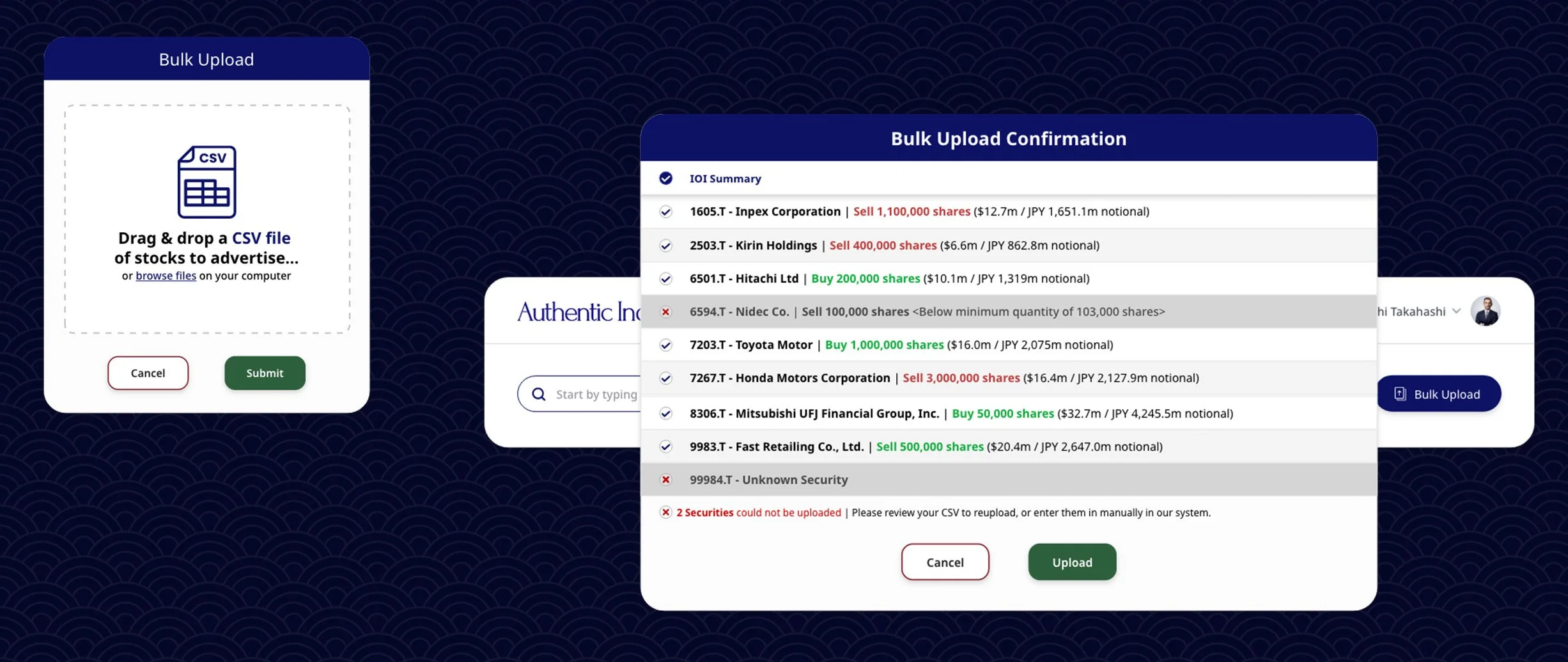 Users managing large portfolios needed to be able to upload multiple IOIs at once via CSV. The Bulk Upload flow handles drag-and-drop file submission, then presents a confirmation screen that validates each line — flagging securities below minimum quantity thresholds or unrecognized tickers inline, with a clear count of how many could not be uploaded and instructions to resolve. Clean, no ambiguity.