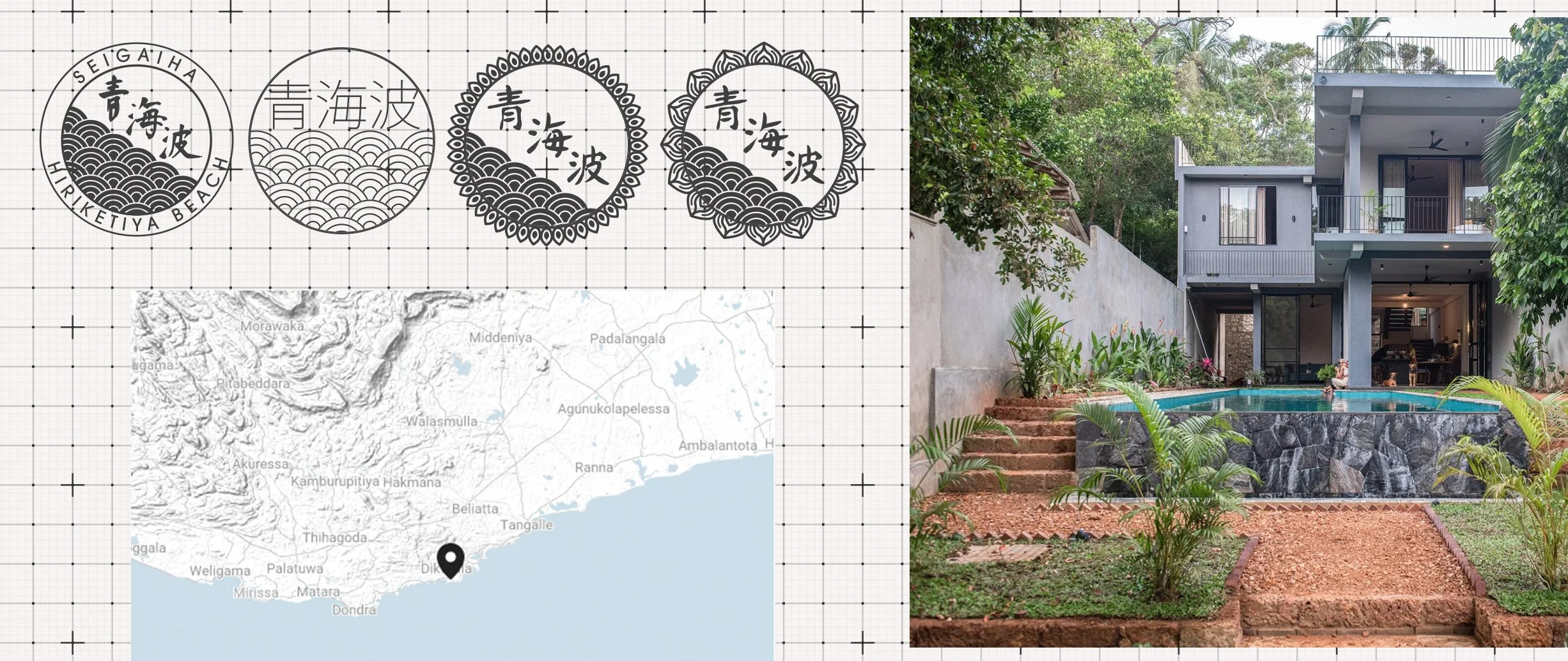 The logo started with the Seigaiha pattern as its foundation — the overlapping wave scales that give the villa its name. Rather than treating it as a flat motif, I reframed it within the circular form of a Kamon (Japanese family crest), wrapping organic vine motifs around the outside to reflect Hiriketiya's jungle setting. The result is a mark that feels rooted in both cultures simultaneously — Japanese in structure, tropical in texture, specific to this one place hidden up a quiet cul-de-sac in a Sri Lankan coastal village. Additional consideration for how it’d fit on website along with goods found in the house was applied.