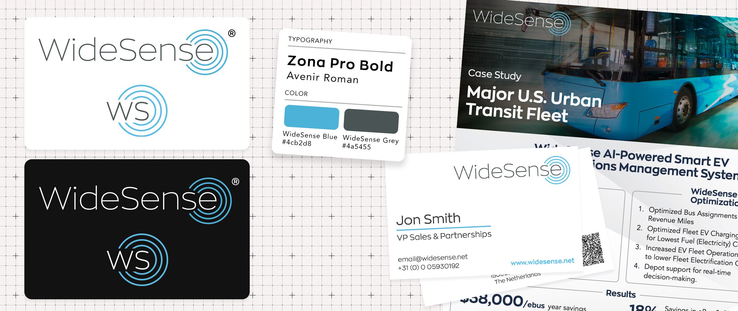 That's where I came in. From the original logo through eight years of investor communications, product design, and international expo appearances, I was the sole design voice for WideSense as it grew from startup to a platform managing over 3,500 electric vehicles across three continents.