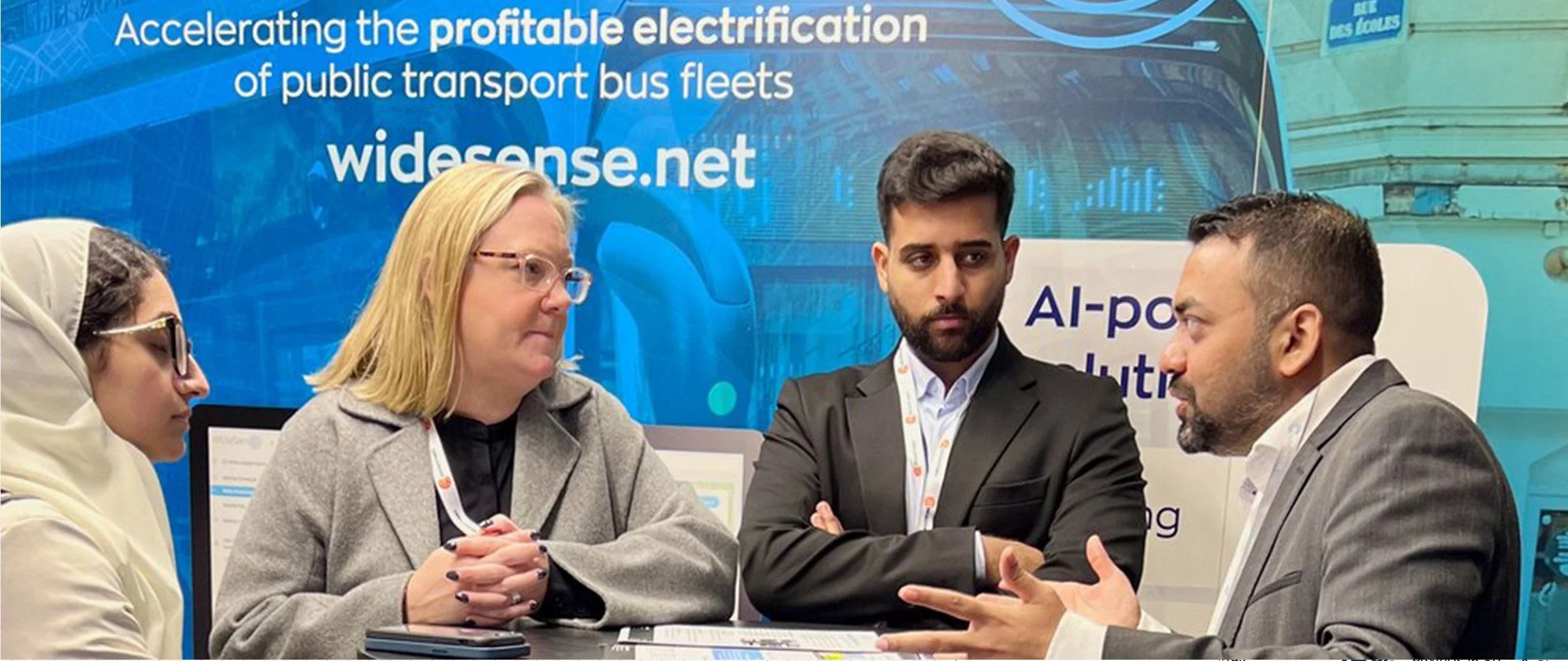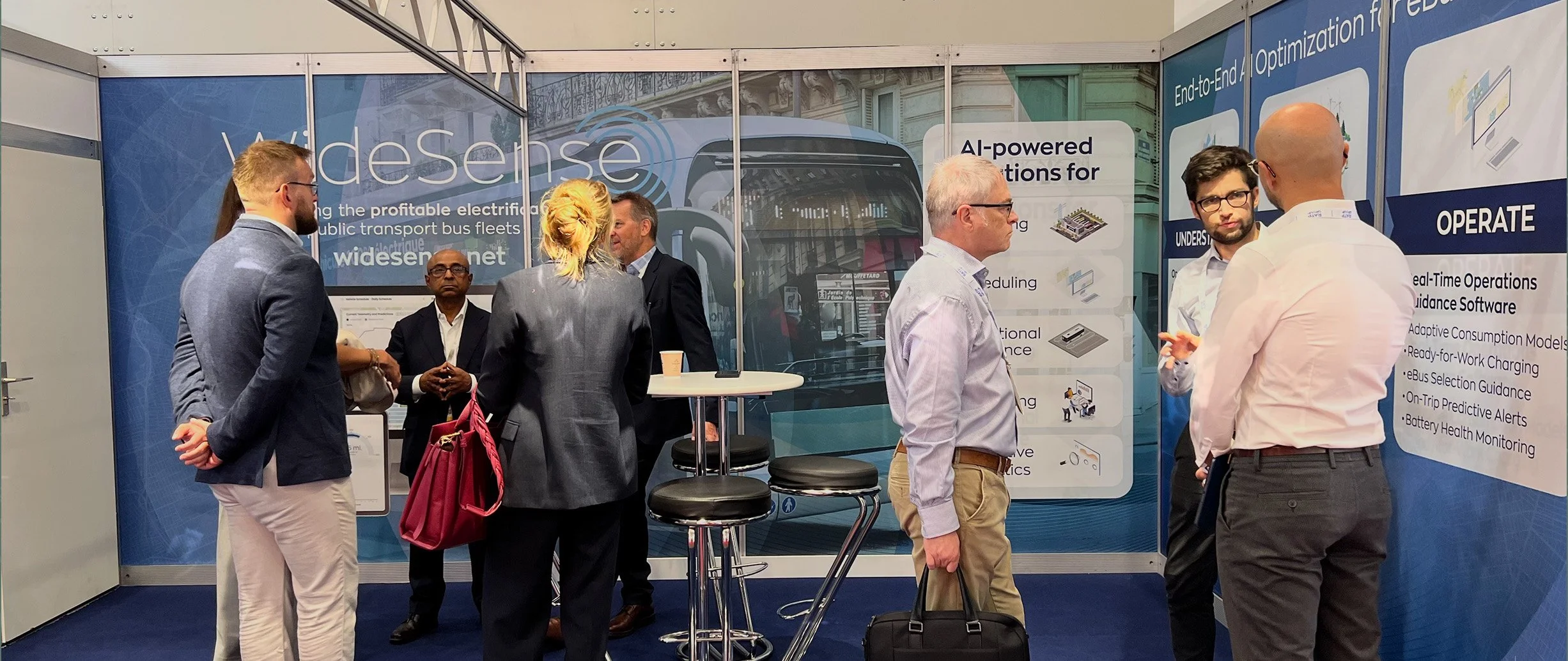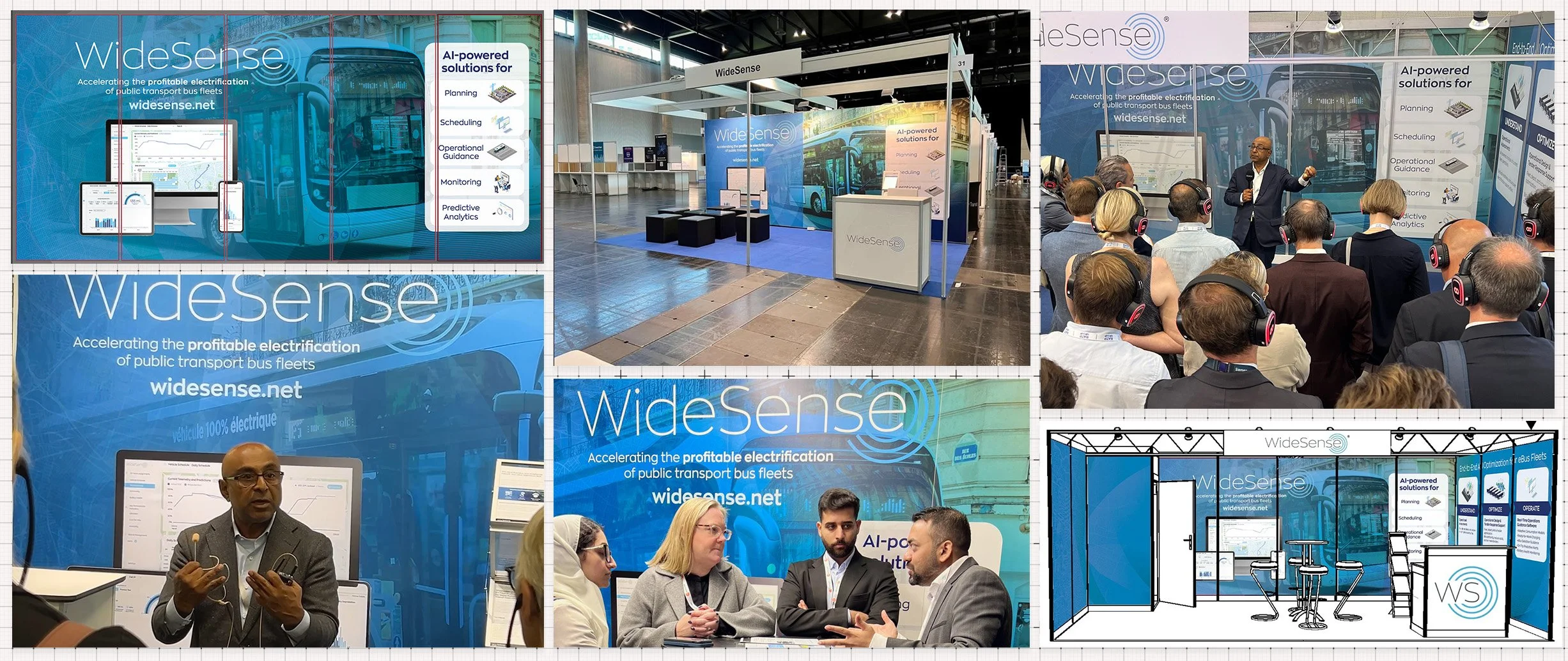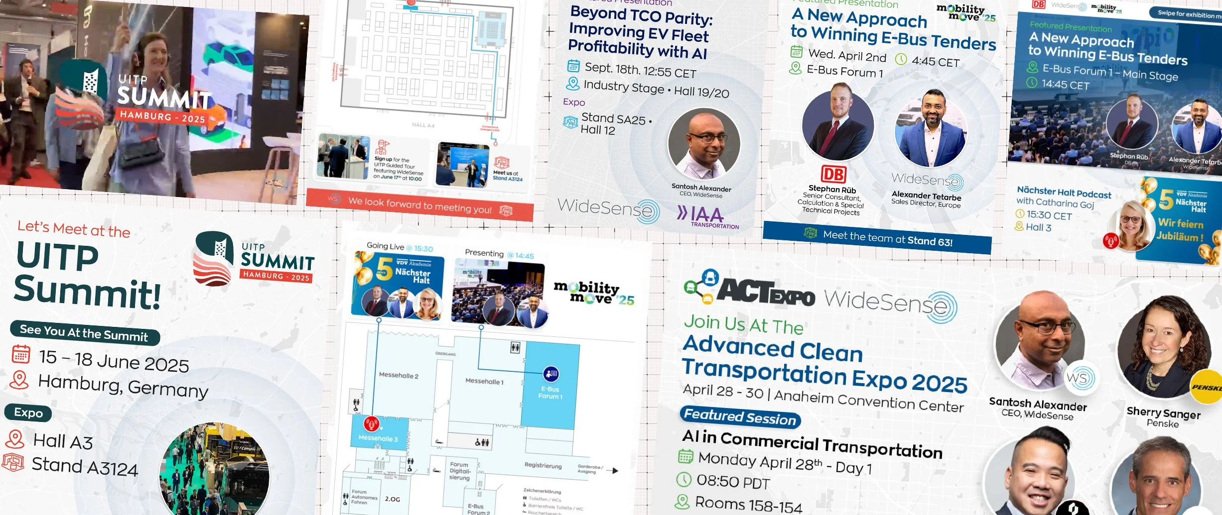 WideSense showed up at the world's major public transport and EV industry events — UITP Summit in Hamburg, ACT Expo, Mobility Move, UK Commercial Vehicle Show, and others across Europe and the US. I designed the booth systems, panel layouts, and supporting materials for multiple appearances — each time translating the WideSense story into a physical space that could hold a scheduled presentation and stop a casual visitor in the same moment.