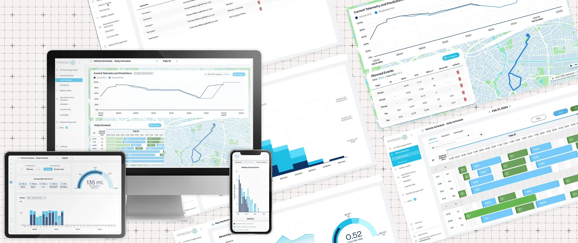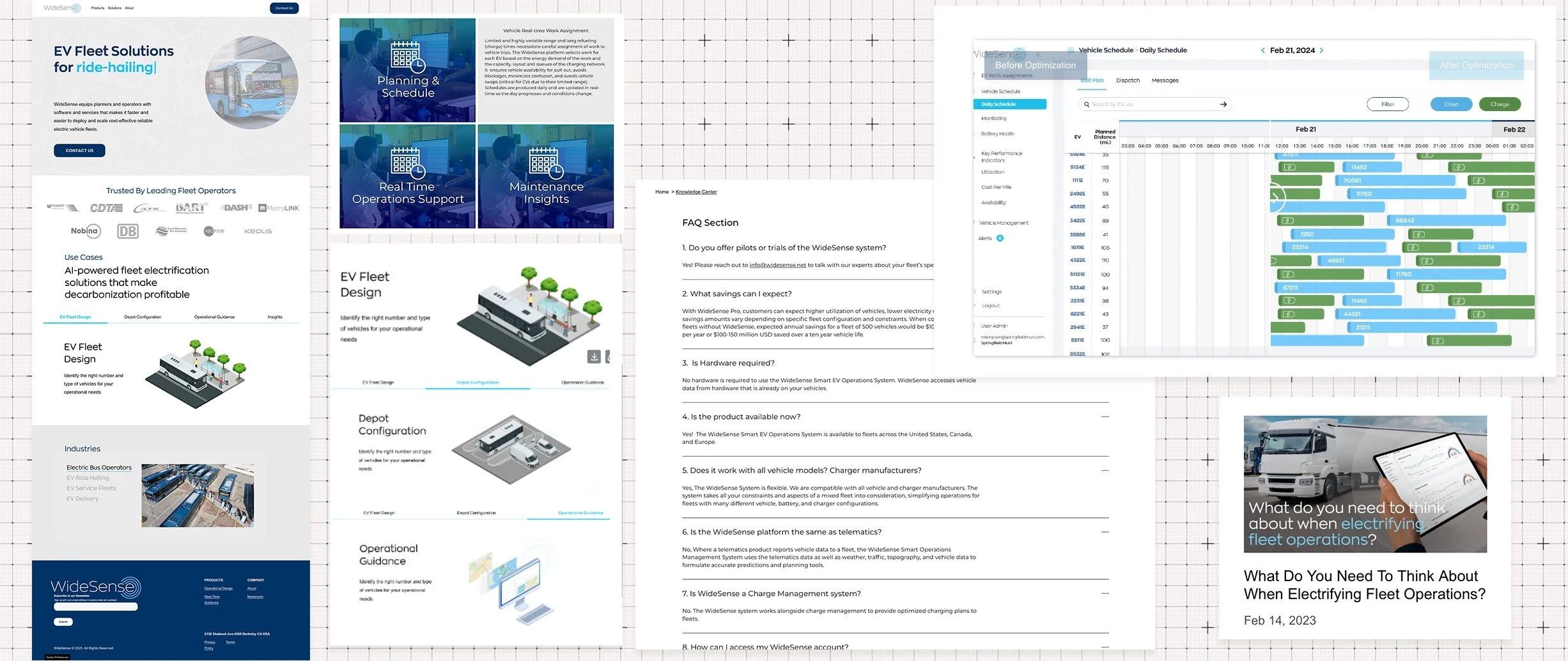 Fleet operators — the people running hundreds of electric buses across complex urban routes — needed a dashboard that made AI-powered energy forecasting, scheduling optimization, and charging management legible and actionable. I contributed UX/UI direction to the dashboard product, working with the engineering team to translate complex data outputs into clear, usable interfaces for a non-technical operational audience. WideSense had since then updated and upgraded this through multiple integrations, providing key findings and testing with multiple operators across the European Union and the U.S. — in turn giving me the tools needed to update styling, UX and ideas for more functionality.